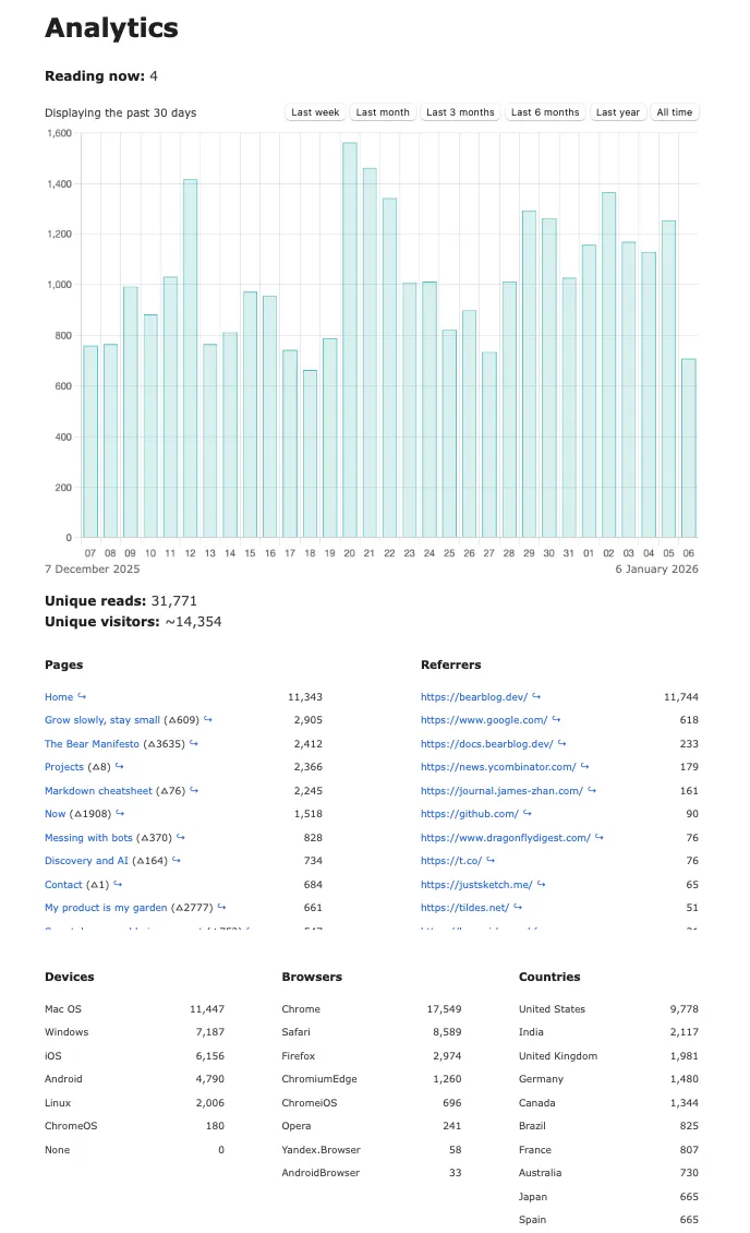 If you need even more in-depth analytics, such as minute-by-minute logs, time-on-site, bounce-rate, granular referrers, etc, then Fathom analytics is a great, privacy-respecting analytics provider. Once you've signed up (get $10 off with the above link), simply add the site ID in the form in Analytics settings on the Bear analytics page and it should JustWork™.